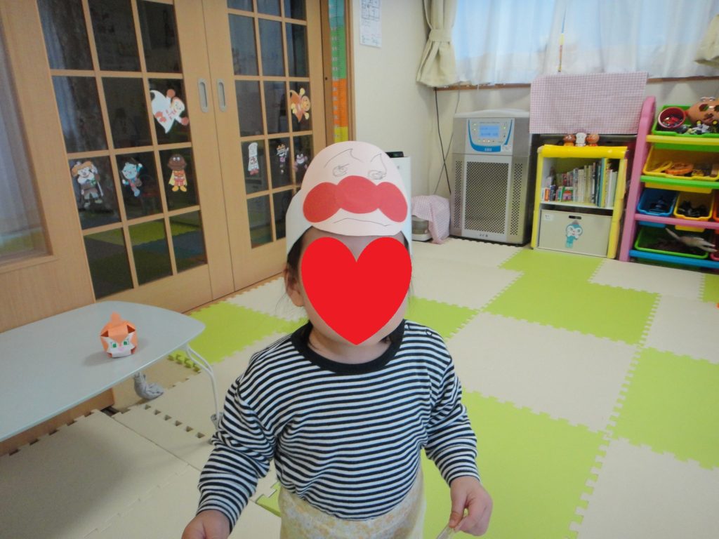 アンパンマンが大好きなNちゃんはスタッフと一緒にアンパンマンのお面を作ると、うれしそうにニコニコしていました。窓に貼ってあるキャラクターのシールをはりかえたりご機嫌で過ごしました(^^)/