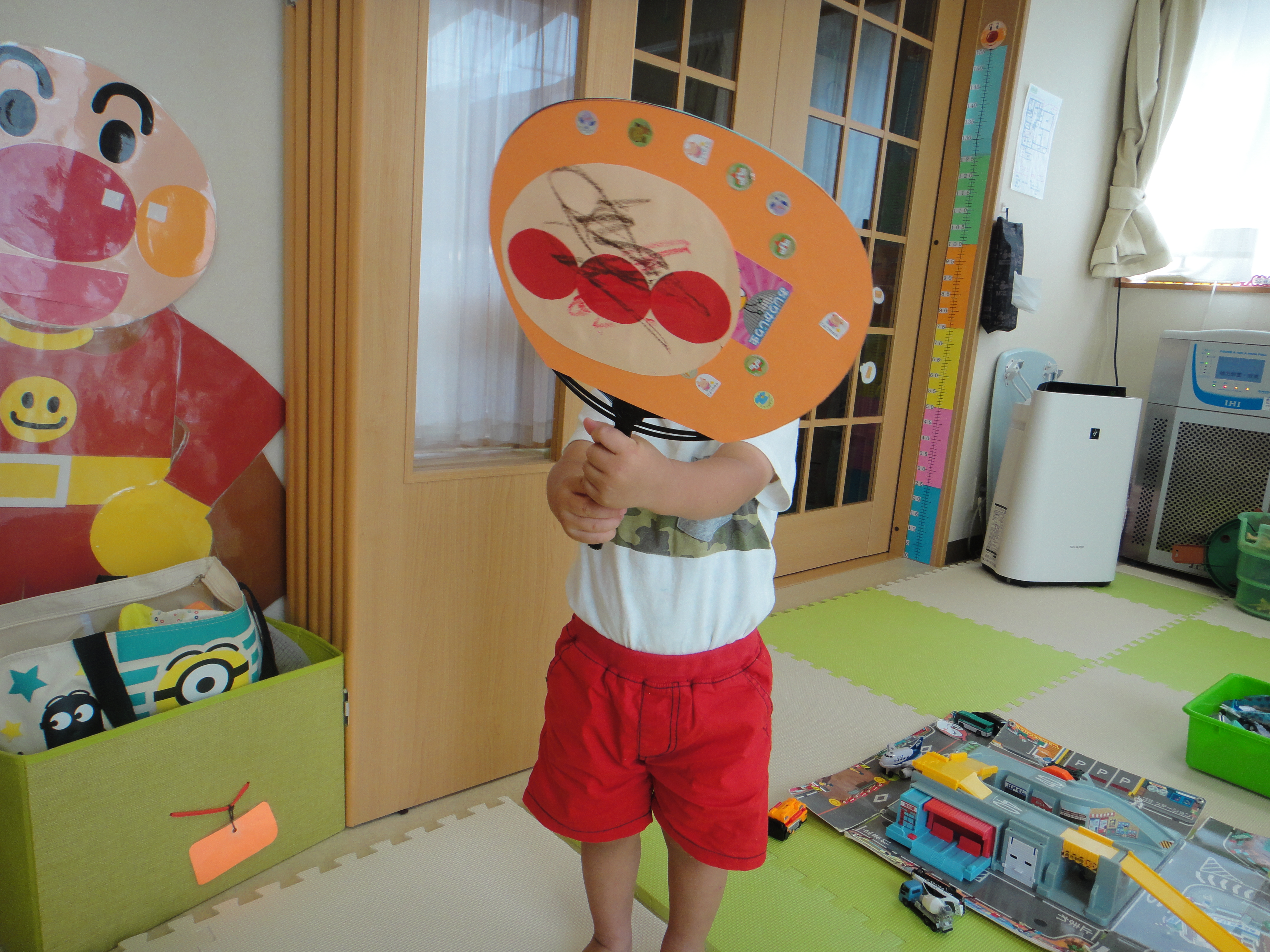 症状も軽くなってきていたので、製作でうちわを作りました(^^)/アンパンマンの顔を描いたり、カエルの顔を描いたり上手にできました。シールも上手に貼ることができ、可愛いうちわが出来上がり嬉しそうでした。スタッフをあおいでくれたり、優しいYくんでした。