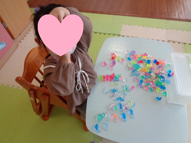 キラキラ透明の宝石がお気に入りのSちゃん。イルカ・ガラスの靴・透明・ピンク・・・など形や色で分けて数を数えたり、イルカを上に何個積み上げられるか挑戦したり、色々な遊び方で楽しんでいました(*^^*)