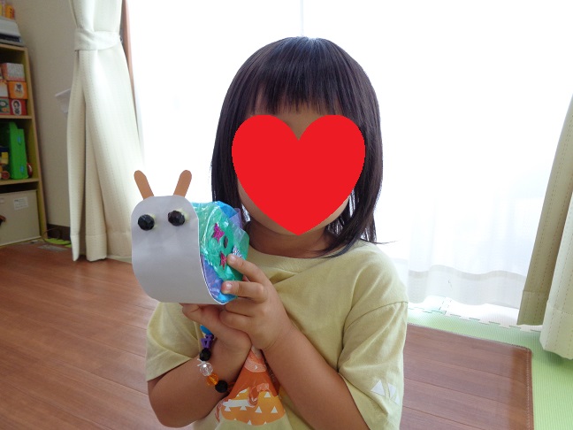 カタツムリ製作の提案したら、子ども園で作ったカタツムリを教えてくれたKちゃん。「じゃあ他の作り方で!」と、Kちゃんのアイディアも取り入れながら立体カタツムリを作りました。出来立てのカタツムリとゴム通しで作ったブレスレットを手首につけて満面の笑みです(^^♪