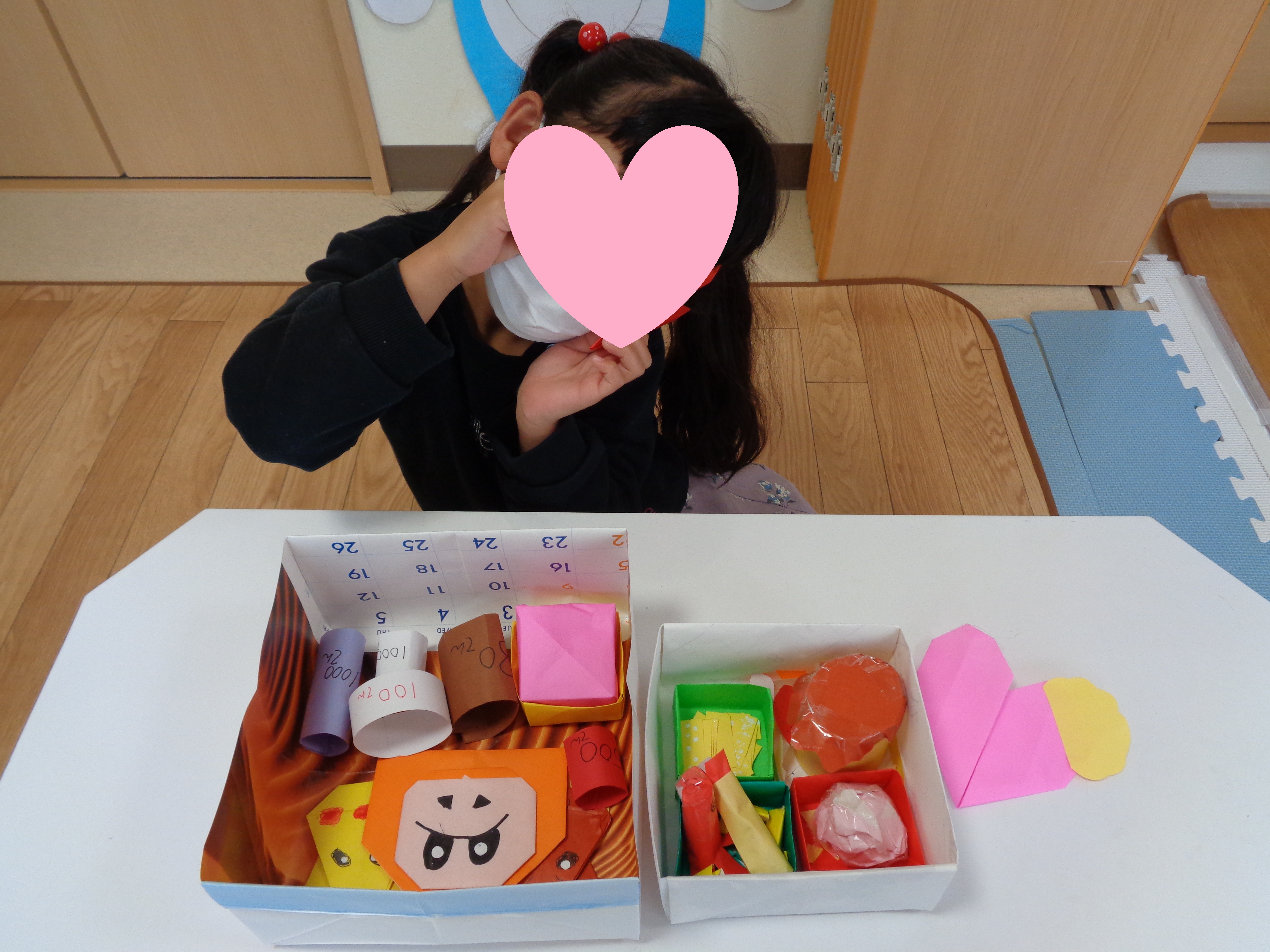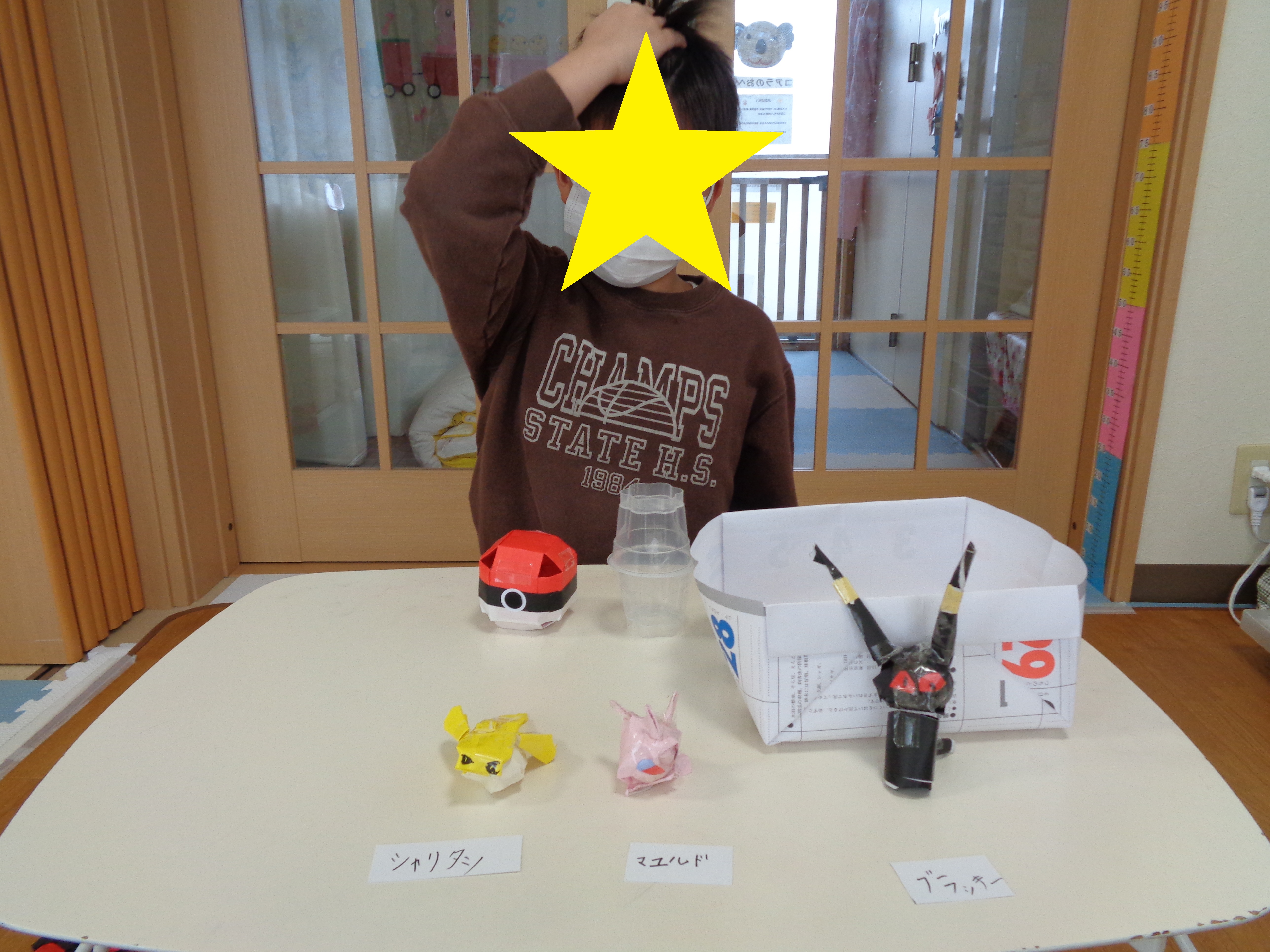 同時期に利用していたYくんとSちゃん。この日は2日目でした。前日に折り紙で作ったポケモンが楽しかったようで、今日も折り紙をしたい!とリクエスト。 Y君は試行錯誤しながら立体のポケモンを作りました。表情をお見せできないのが残念ですが、かっこいい表情とポーズで記念写真を撮らせてくれました(*^^*) Sちゃんは大好きなおかずとデザートをいっぱい詰めたお弁当を作りました!見えにくいのですが、タコさんウィンナーの下の卵焼きは巻いてあるし、ポテトにはちゃんと塩がかかっています。 たくさんお話しながら楽しそうに作っていました(*^-^*)